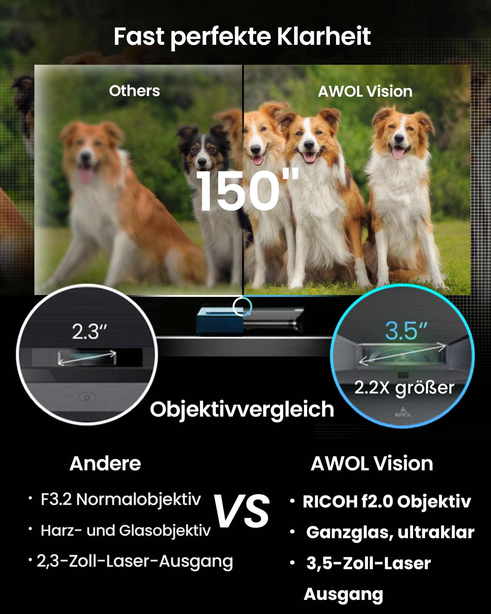 Der AWOL VISION LTV-2500 Ultra-Kurzdistanz-Projektor bietet nicht nur eine extrem hohe Helligkeit und ein intelligentes Steuerungssystem, sondern auch eine ultrahochauflösende Bild- und Mehrschicht-Farbwiedergabe. In Kombination mit der Daylight Series Fresnel ALR-Leinwand kann er auch bei kontrollierten, hellen Lichtverhältnissen in Ihrem Wohnzimmer verwendet werden. Das Paket beinhaltet den Fire TV Stick 4K Max für Ihre audiovisuellen Bedürfnisse.