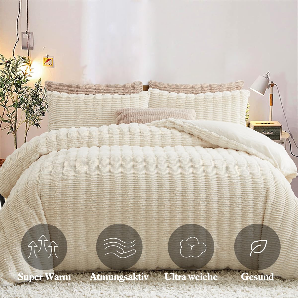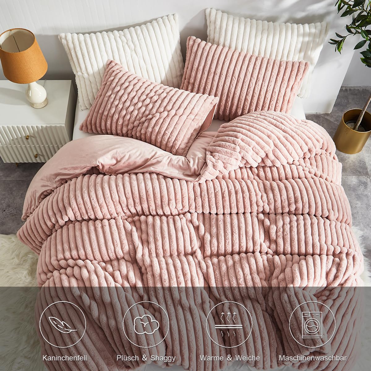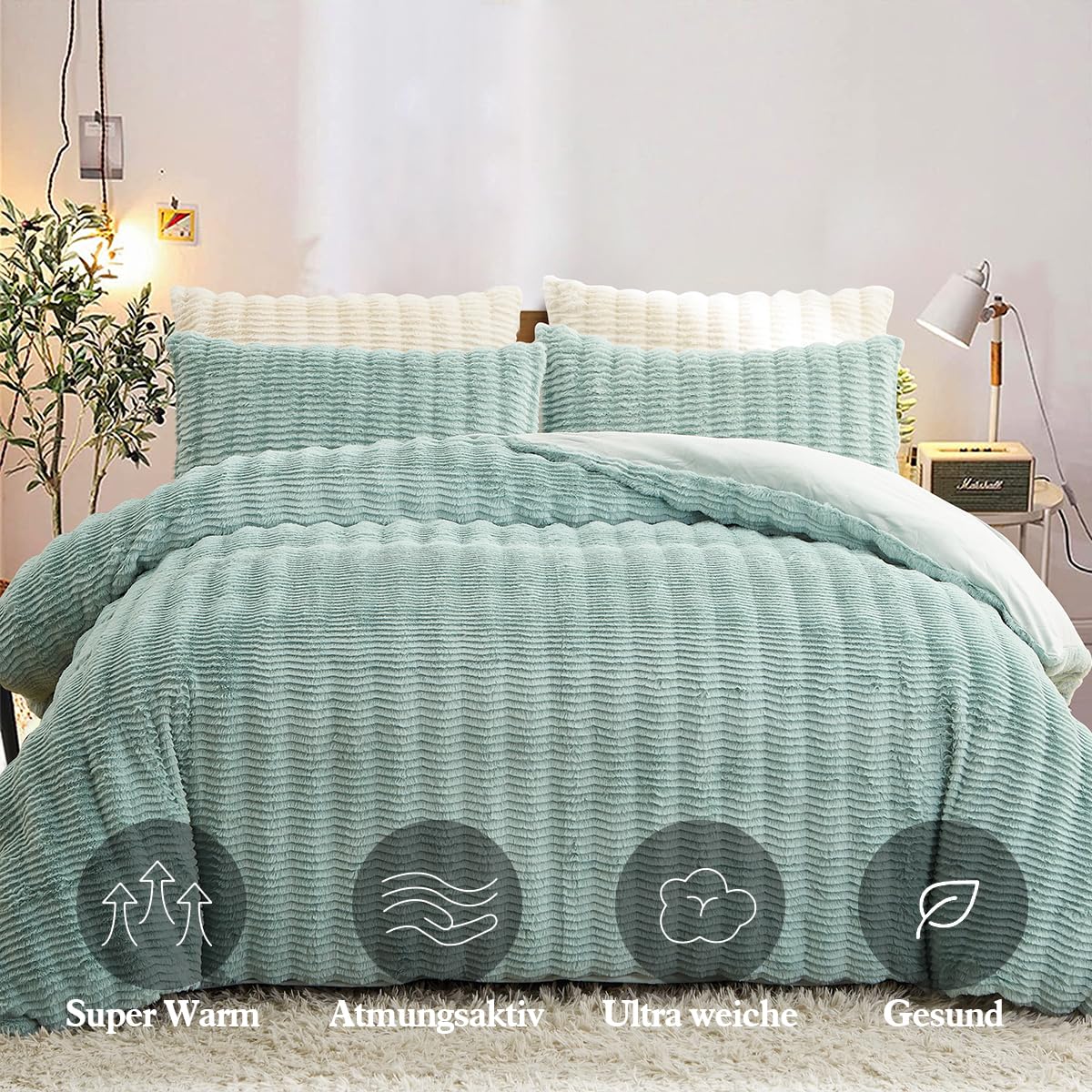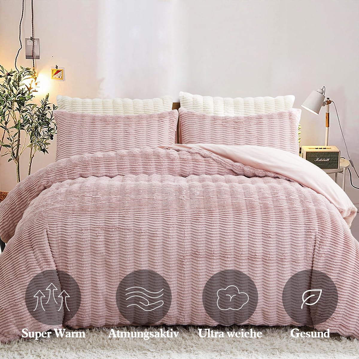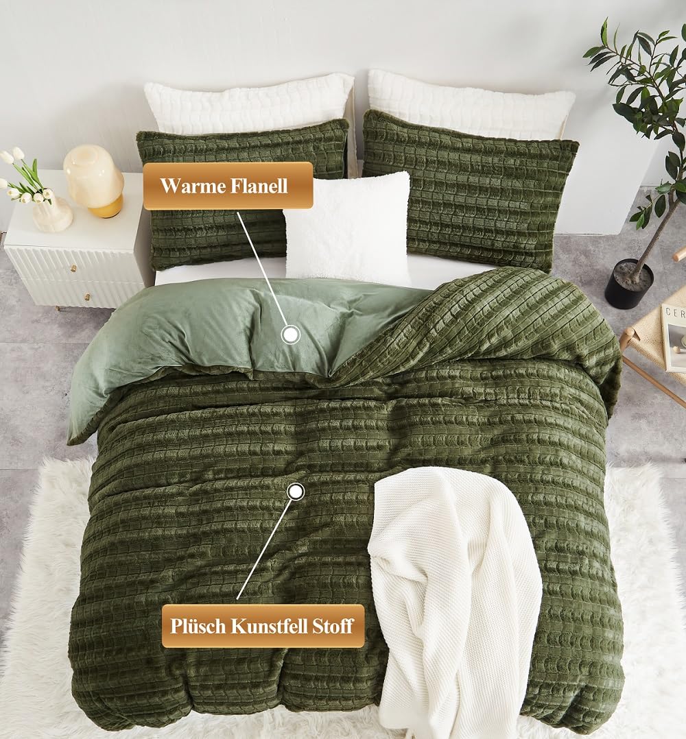 - Premium Material:Die Vorderseite des Bettbezug und Kissenbezug aus Kunstkaninchenfell besteht aus 100% Mikrofaser Plüsch Stoff,und die Rückseite Besteht aus Ultraweichem Flanell Stoff.Beständigkeit gegen Verblassen,Faltenbildung,Pilling-Resistent.Verleihen Sie einen Hauch von Anmut Bringen Sie Farbe in Ihr Zimmer.Bietet außerdem beste Wärme und angenehme Atmungsaktivität.