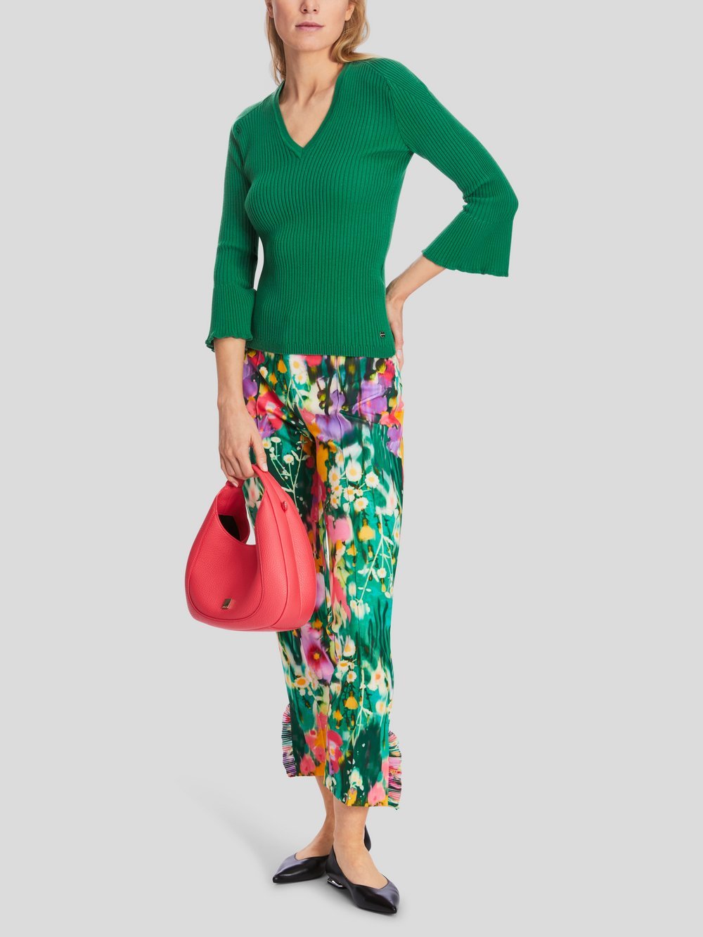 Slim-Fit-Feinstrickpullover aus Viskose mit durchgehender Plissierung. Die Vorderseite ist mit einem dekorativen Federdruck versehen, während die Rückseite unifarben gehalten ist. Der U-Boot-Ausschnitt rundet das Design stilvoll ab. Dieser Pullover wird in Deutschland gestrickt und veredelt. Die einzelnen Teile werden anschließend bei europäischen Partnerunternehmen weiterverarbeitet. Somit ist er Knitted in Germany