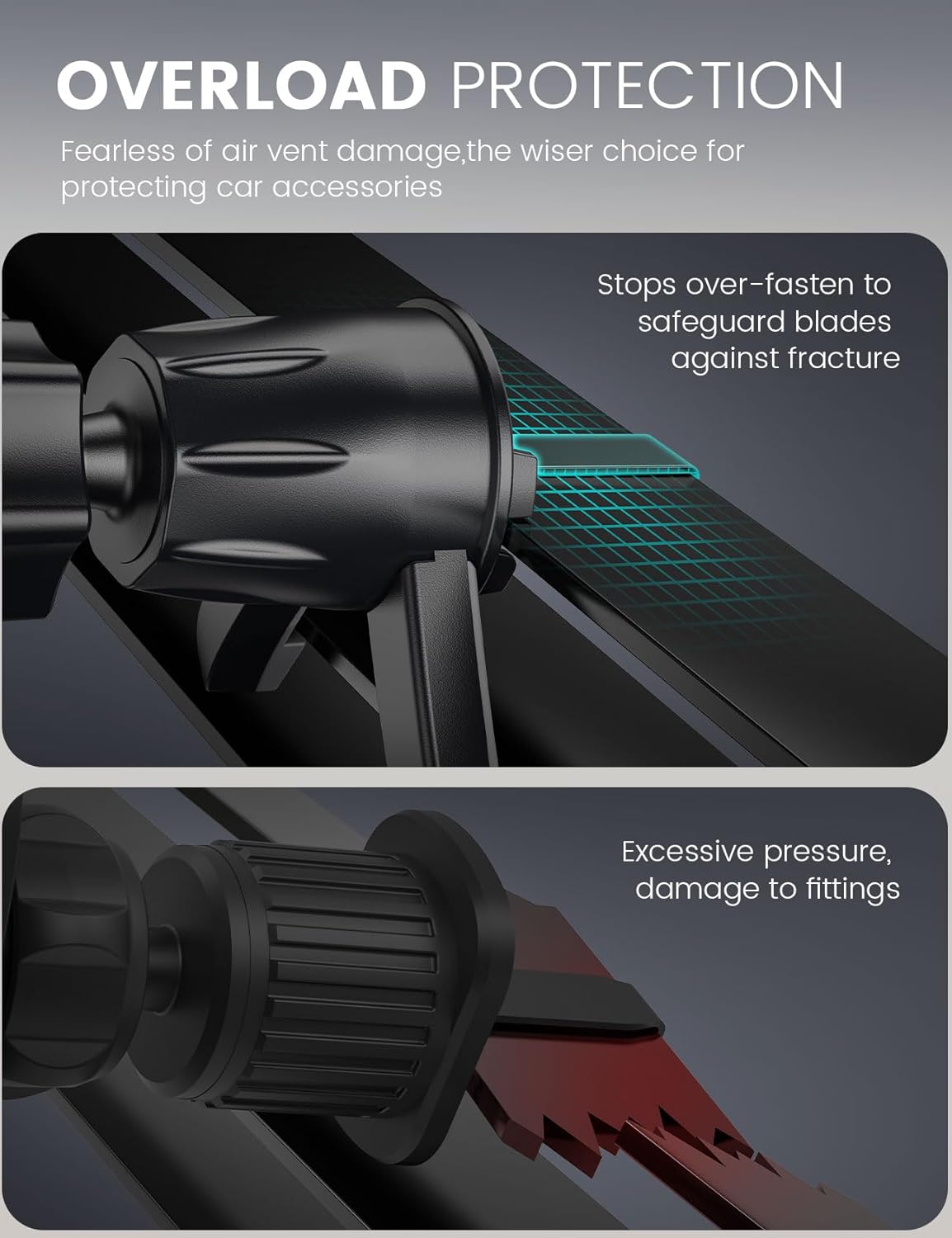 - Verbesserter Schutz-Autotelefonhalter: Anders als andere Produkte auf dem Markt zeichnet sich der Autotelefonhalter durch einen Feststellknopf mit Überlastungsschutz aus. Sobald er angemessen festgezogen ist, hört er automatisch auf, Druck auf den Lüftungsschlitz auszuüben. Unser Produkt hat strenge Tests bestanden und hält das Telefon sicher auf glatten Straßen, Geschwindbremshügeln und sogar auf rauem Gelände, ohne zu wackeln oder Geräusche zu verursachen.