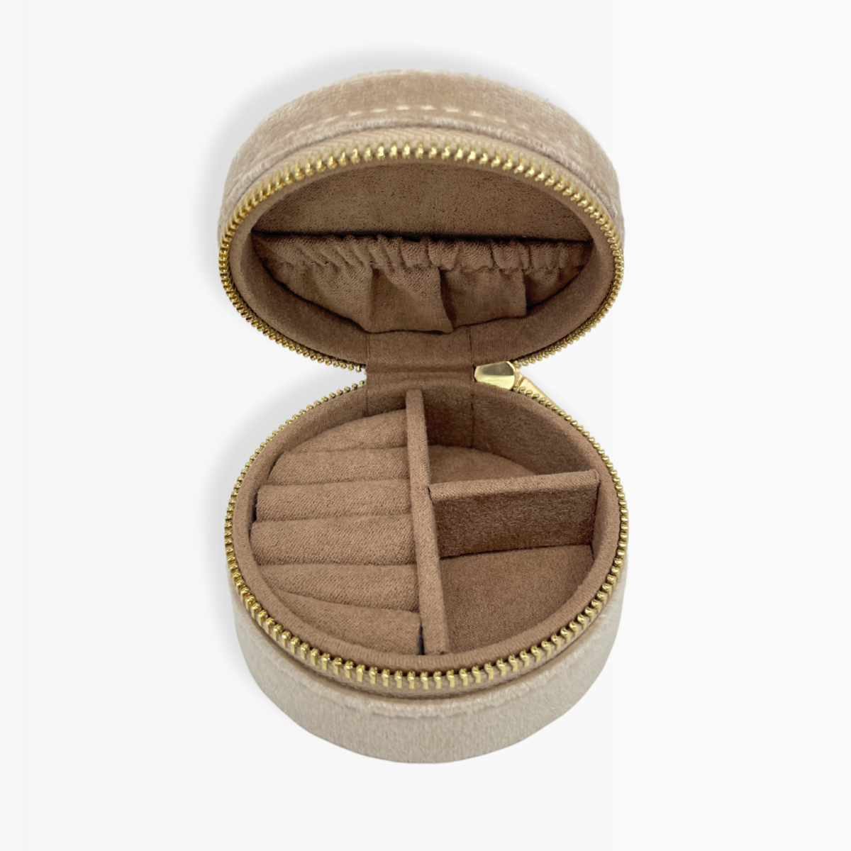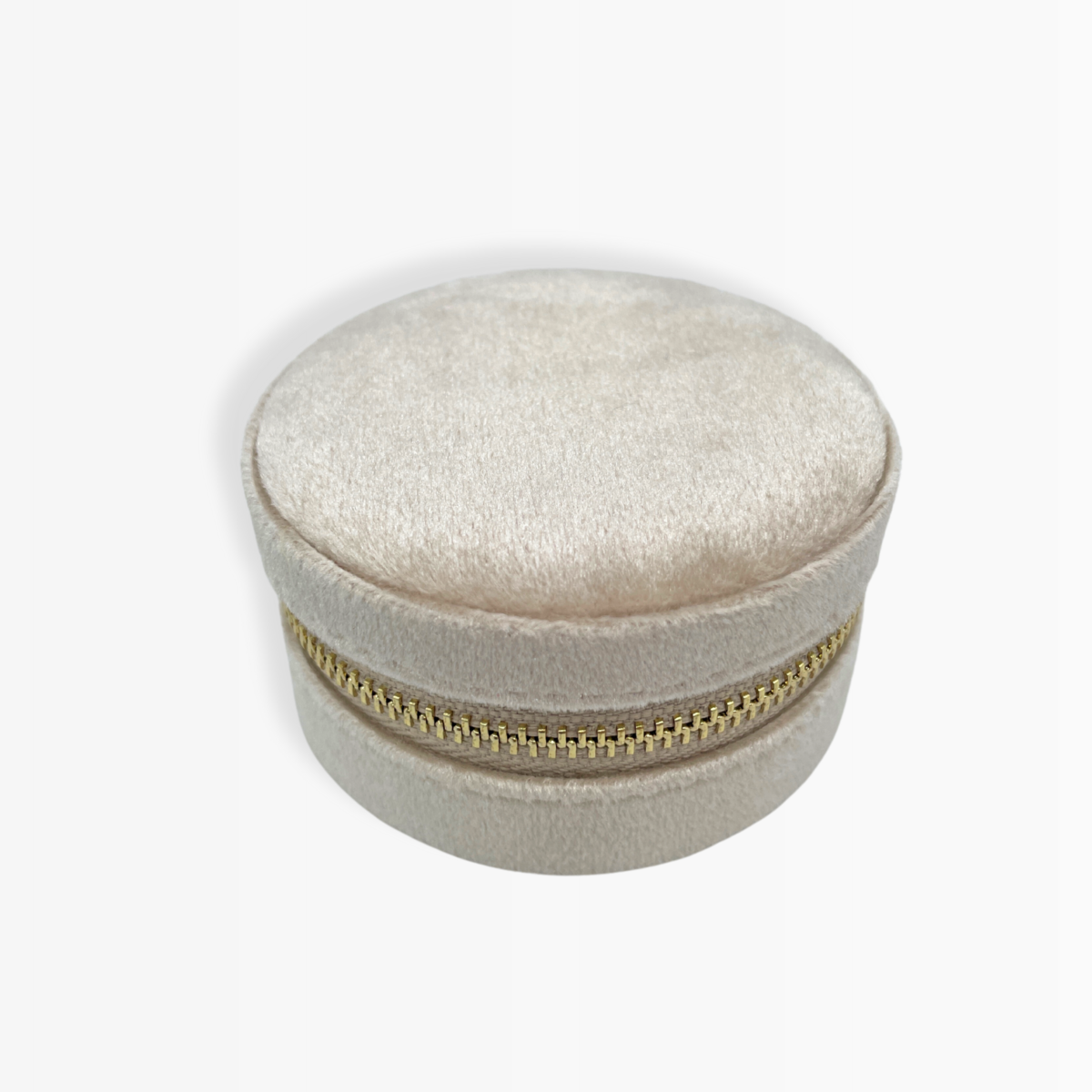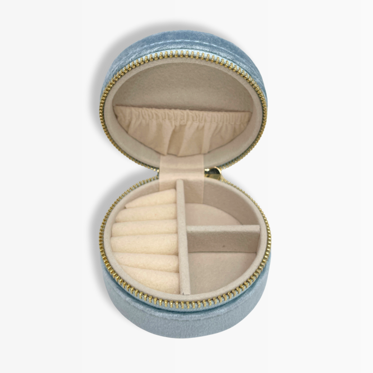 Schmuckschatulle - praktische Samtbox, die perfekt in deine Handtasche passt und ideal für Reisen geeignet ist. Die Schatulle verfügt über einen goldfarbenen Reißverschluss, der nicht nur einen eleganten Akzent setzt, sondern auch sicherstellt, dass deine Schmuckstücke gut geschützt sind. Innerhalb der Schmuckschatulle gibt es spezielle Fächer für Ohrringe, Ringe und Ketten, damit du deine Schmuckstücke organisiert aufbewahren kannst. Dies sorgt dafür, dass sie sich nicht verheddern oder beschädigt werden. Ein weiteres praktisches Merkmal dieser Schmuckschatulle ist der integrierte Spiegel. So kannst du deine Schmuckstücke direkt in der Box betrachten und beim Tragen überprüfen, ob alles perfekt sitzt. Mit dieser Schmuckschatulle hast du eine stilvolle und praktische Lösung für die Aufbewahrung deines Schmucks. Details:- Samt hellblau oder beige- Reißverschluss gold- Ringfach und Kettenfach Größe:- 8 cm x 4 cm
